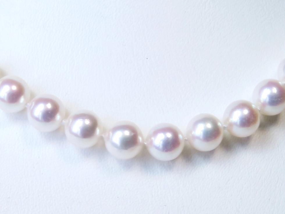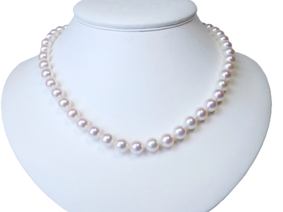 Kette höchster Qualität aus japanischen Akoyaperlen mit einem Durchmesser von 8-8,5mm. Die Perlen sind perfekt rund, strahlen mit ausgezeichnetem Lüster und zeigen nur ganz minimale Wachstumsmerkmale.