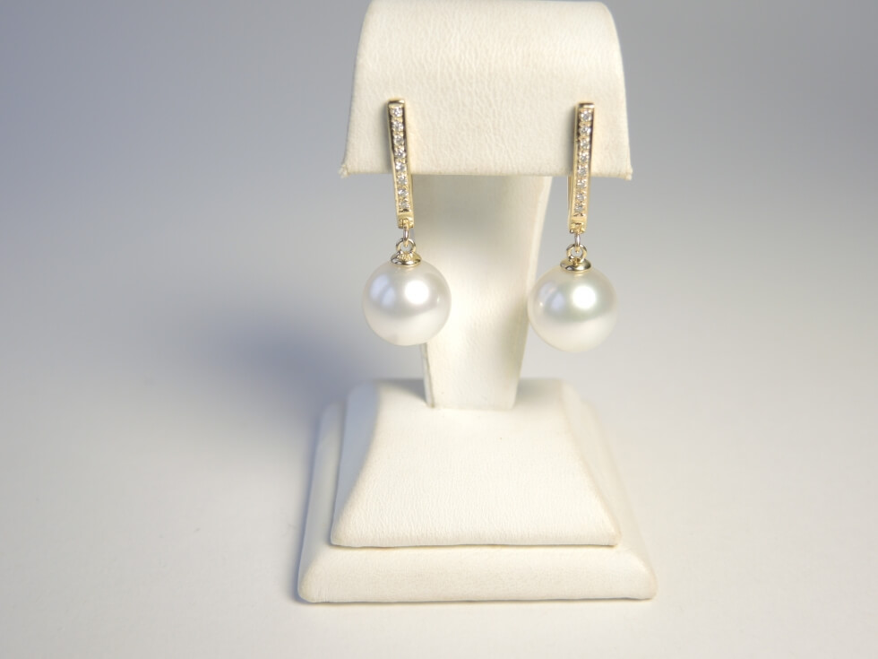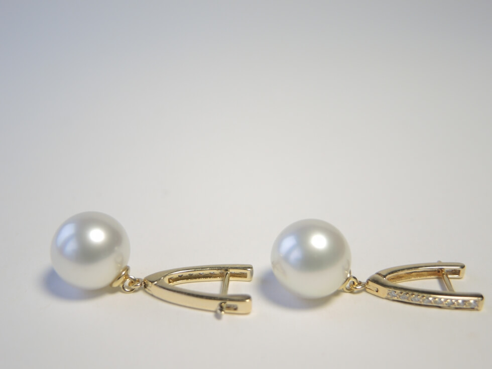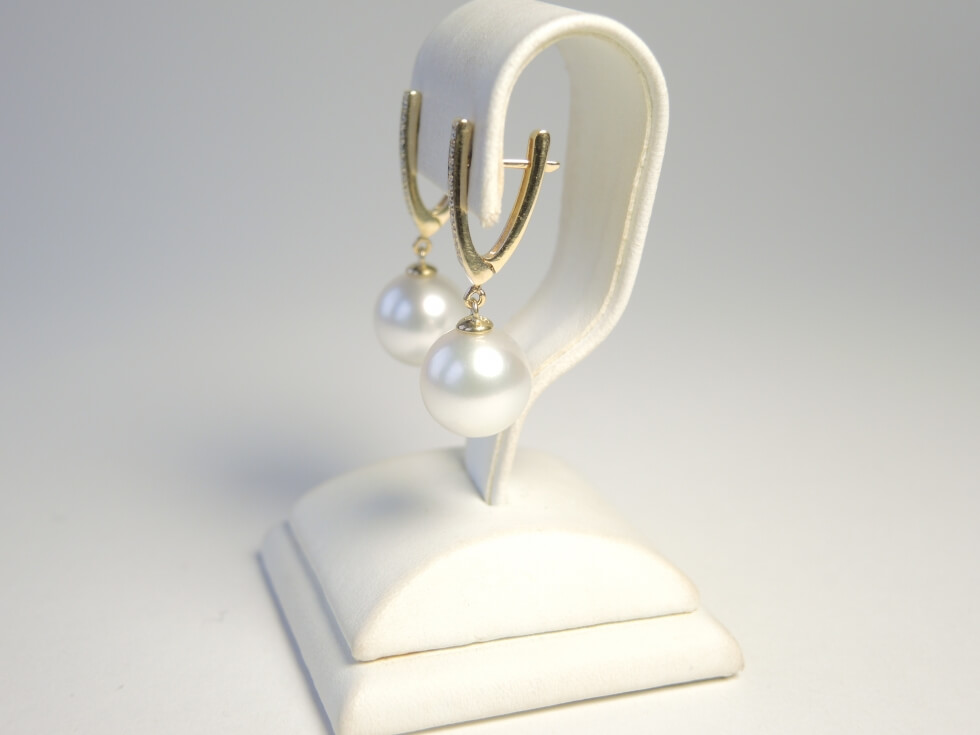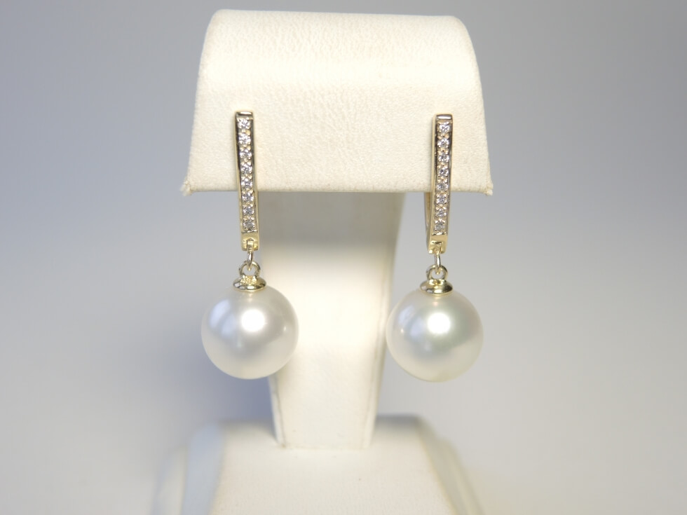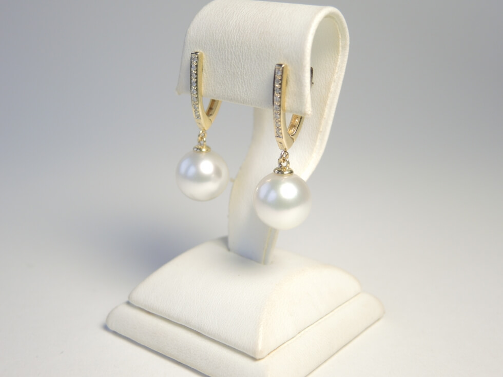 Wunderschön anzusehen sind diese formschönen Ohrhänger aus 585er Gold mit großen glanzvollen weißen Südseeperlen. Die eleganten Goldbrisuren sind mit je 8 Diamanten von insgesamt 0,12ct bestückt. Die Perlen - Oberfläche, Glanz, runde Form - sind von höchster Qualität.
