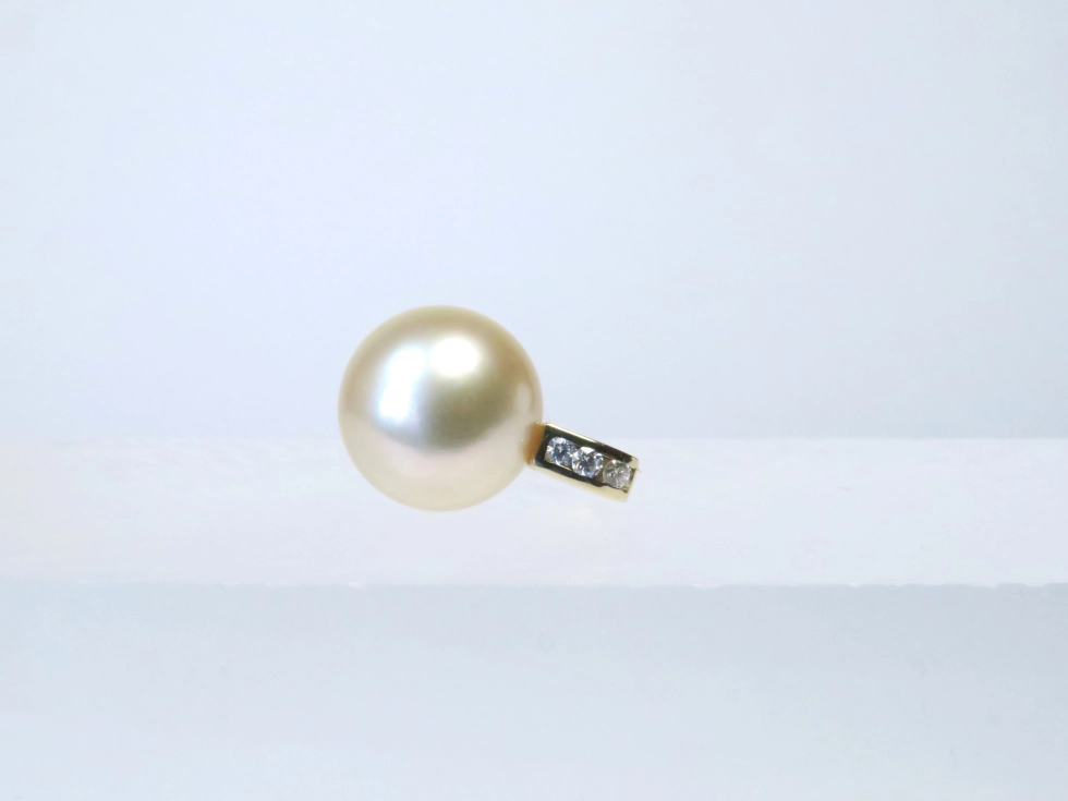 Perlenanhänger mit heller champagnerfarbener 14 mm Südseeperle. Die naturfarbene runde Südseeperle ist makellos und von sehr schönem Glanz