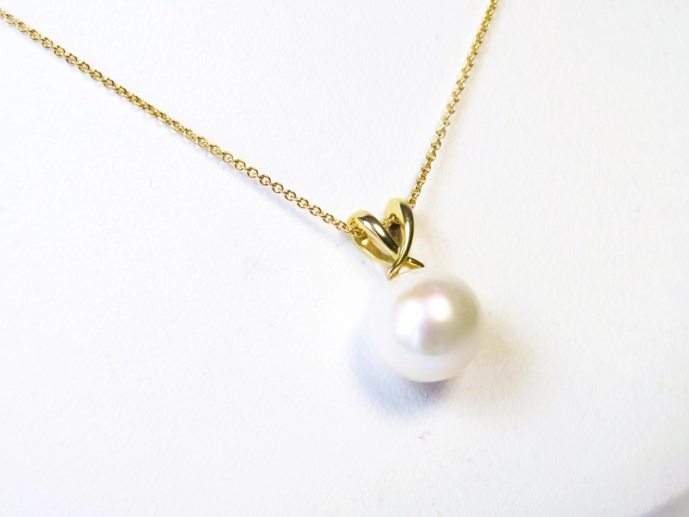 Eine runde, makellose Ming Süßwasserperle mit ausgezeichnetem Glanz hängt an einerm schön geschwungenen Anhänger aus 14kt. Gold.