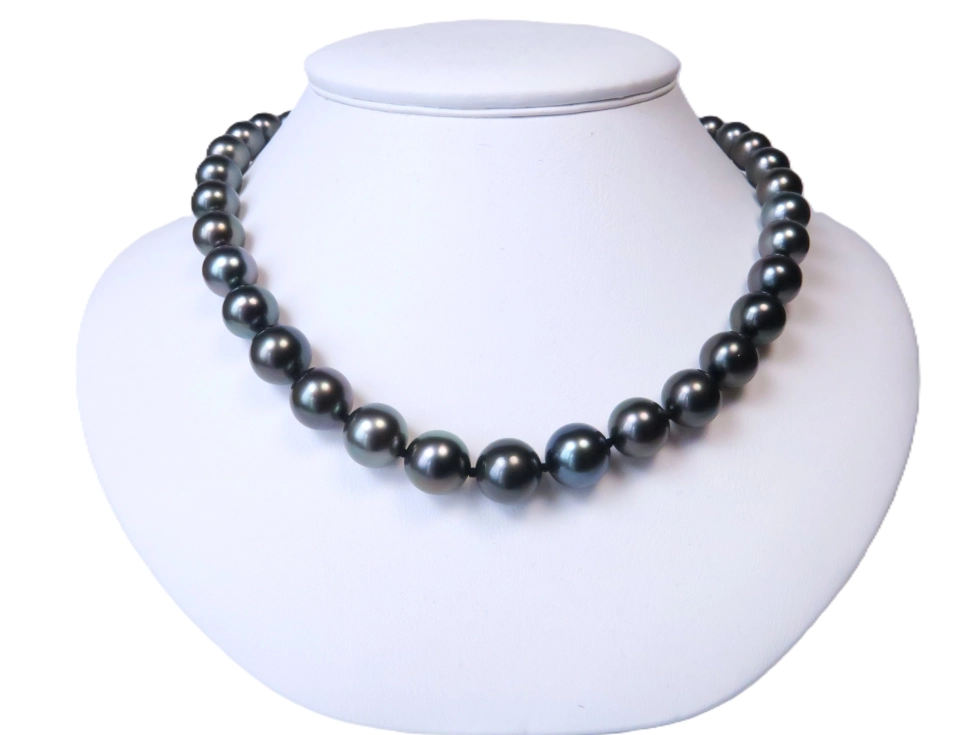 Die Tahitizuchtperlen haben einen Verlauf von 10 - 12 mm. Das heißt die kleinste Perle neben der Schließe misst 10mm, die größte Perle in der Mitte des Colliers hat einen Durchmesser von 12 mm.