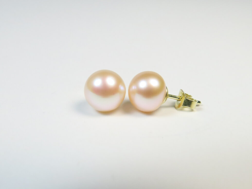 Große Perlen in wunderschönem zarten Pfirsich Ton sind auf solide Stecker aus 585er/14kt. Gold gesetzt.